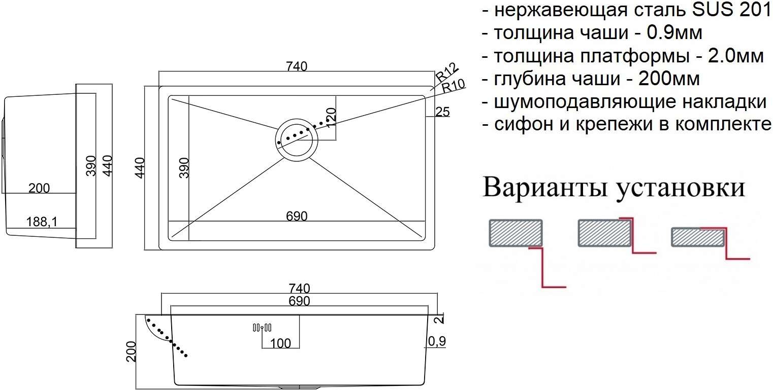 СПОСОБ УСТАНОВКИ: Сверху на столешницу, Под столешницу, Вровень со столешницей