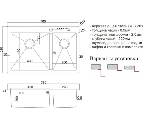 Чаша мойки выполнена из нержавеющей стали толщиной 0.9 мм, а кант (бортик) имеет толщину 2 мм, что позволяет ей идеально ложиться на поверхность столешницы.