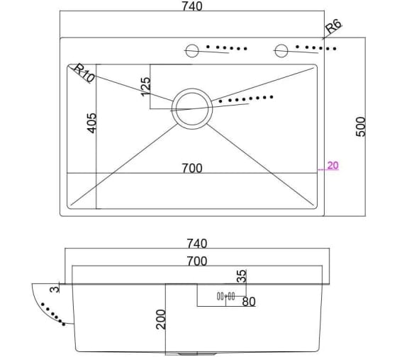 Имеет R5 радиус закругления с внешней стороны. Внутренние углы с R10 радиусом закругления.