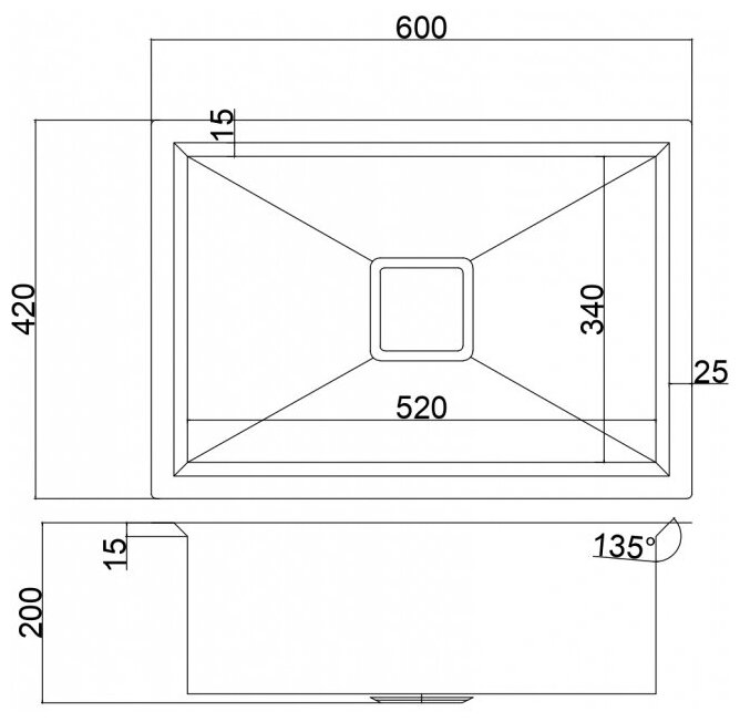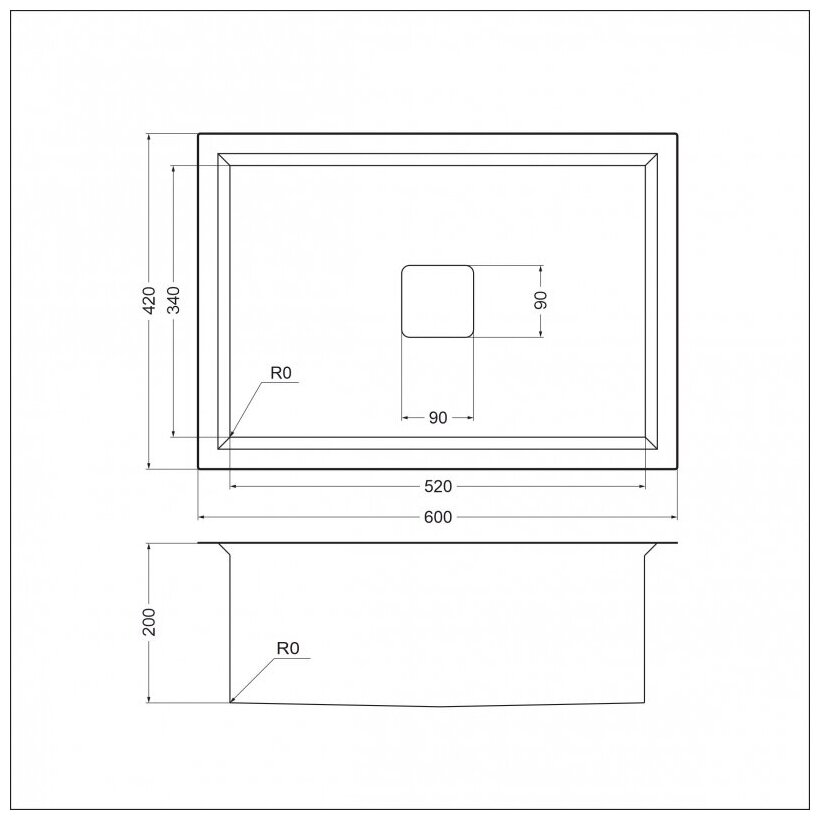 Мойка с необычной формой EMAR EMB-129A имеет размеры 600 x 420 мм и R0 радиус закругления с внешней стороны. Внутренние углы также без закруглений.