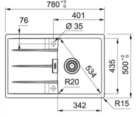 - Вырез для монтажа вровень 785 х 503 х 7, R17