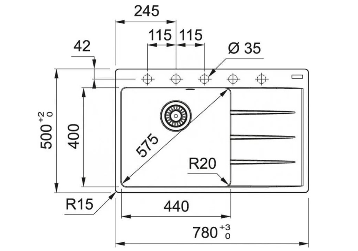 С обратной стороны сформированы пять отверстий диаметром 35 мм для смесителя, дозатора и кнопки управления диспоузером. Крепления FastFix обеспечивают легкий монтаж.Ключевые преимущества: