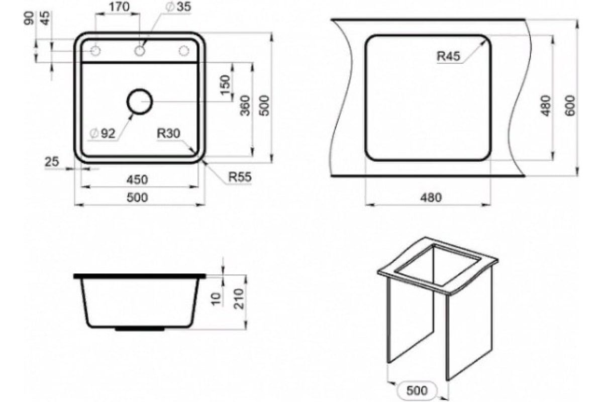 Врезная мойка имеет квадратную форму и размер 500 на 500 мм, что позволяет использовать ее в широком диапазоне кухонных помещений.