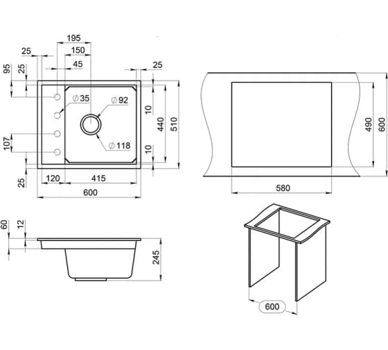 Глубина чаши, мм 245