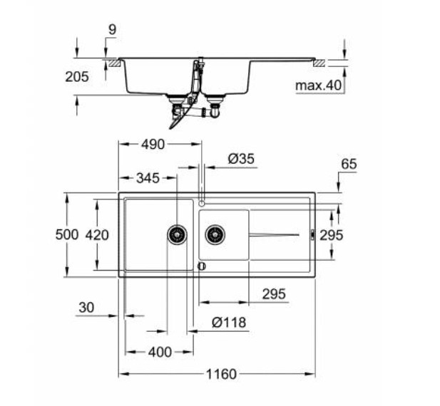 - требуемый размер отверстия в столешнице для установки мойки: 1140 x 480 мм