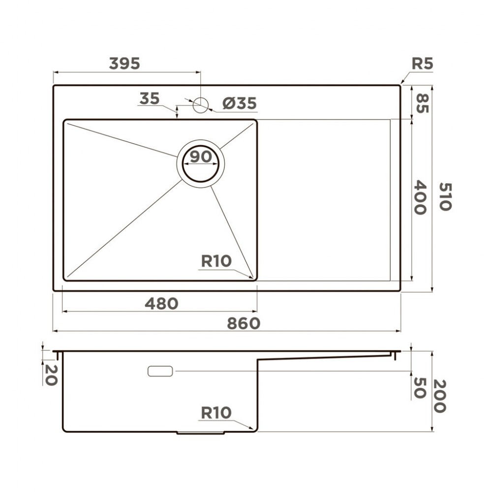 Толщина материала мойки, мм