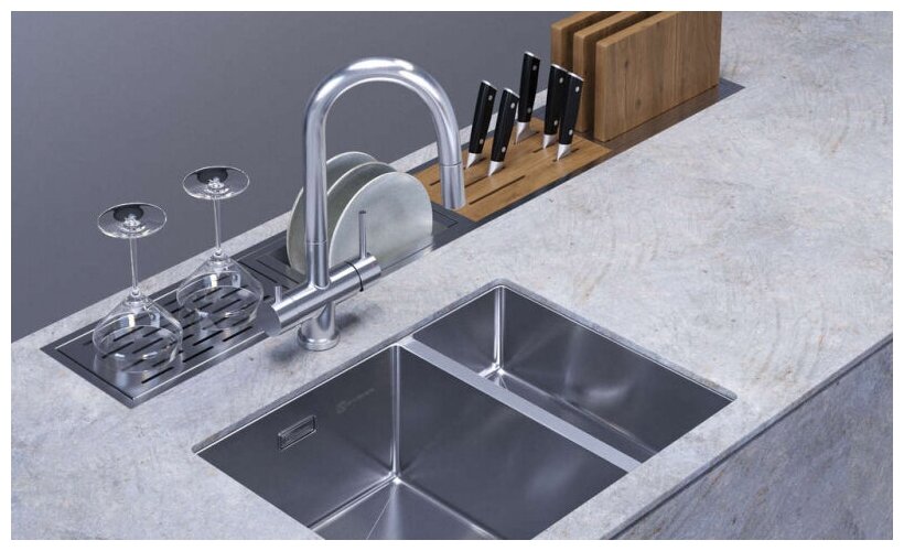 Мойку можно установить под столешницу, вровень, а также стандартным врезным способом, что делает её универсальной. Наиболее популярный способ установки – подстольный монтаж, при котором чаша мойки устанавливается ниже уровня столешницы. Это создает дополнительную легкость в обслуживании рабочего пространства и обеспечивает более высокий уровень гигиены.