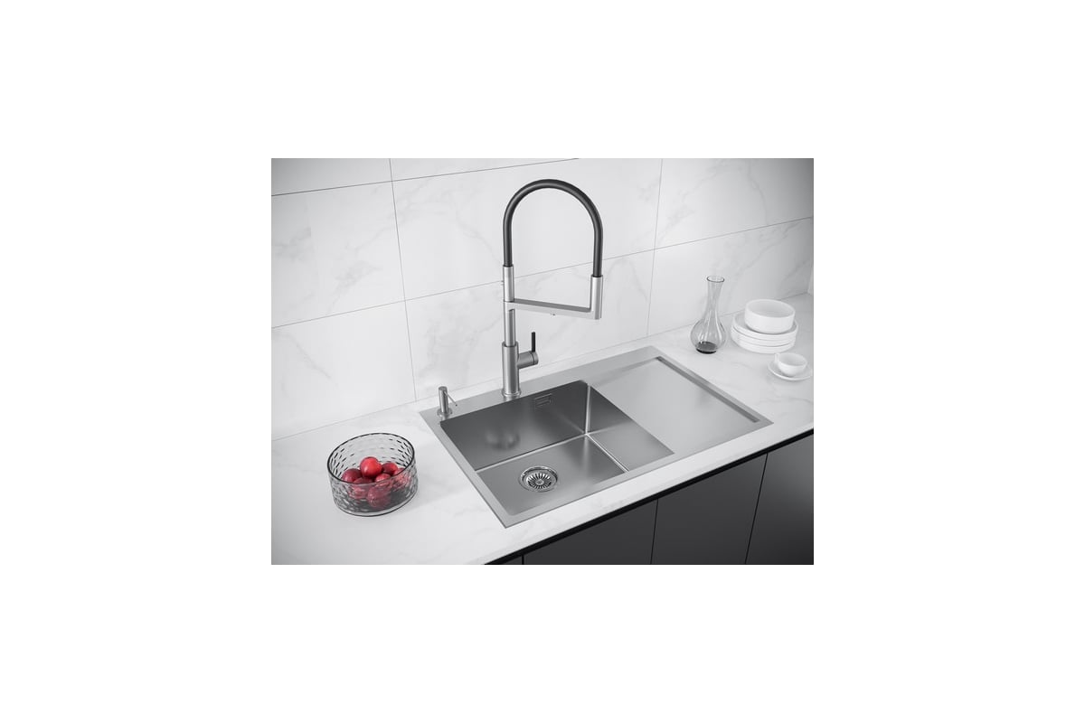 Бортики мойки ATLAN EDGE имеют оригинальную форму боковой грани со скосом 45˚, что дает повышенную эстетику и легкость в уходе. Изготовлена из нержавеющей стали, обладающей высокой коррозионной стойкостью, большим запасом механической прочности, а также устойчивостью к воздействию кислот и других химически активных соединений.