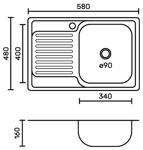 Габаритные размеры: ширина 580 мм, длина 480 мм, глубина 160 мм, толщина стали 0,6 мм.