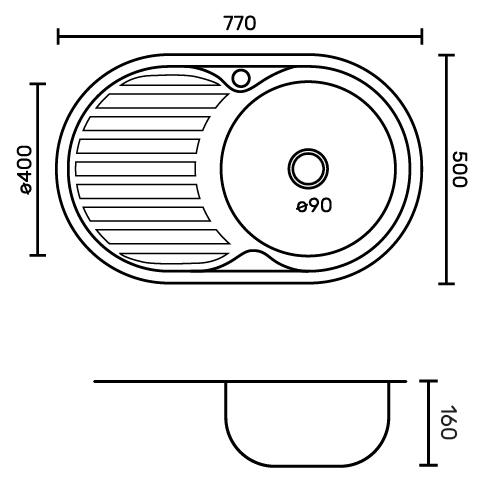 Габаритные размеры: ширина 770 мм, длина 500 мм, глубина 160 мм, толщина стали 0,6 мм.