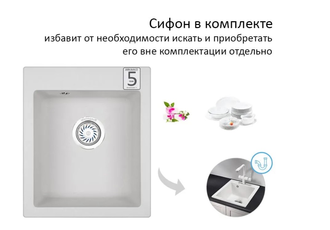 - Сифон, прилагающийся в комплекте с мойкой, избавит вас от необходимости искать и приобретать его дополнительно. Теперь вы можете выполнить монтаж мойки и сифона практически сразу "под ключ", ведь мы в Weissgauff знаем, как важно и ценно время наших клиентов!