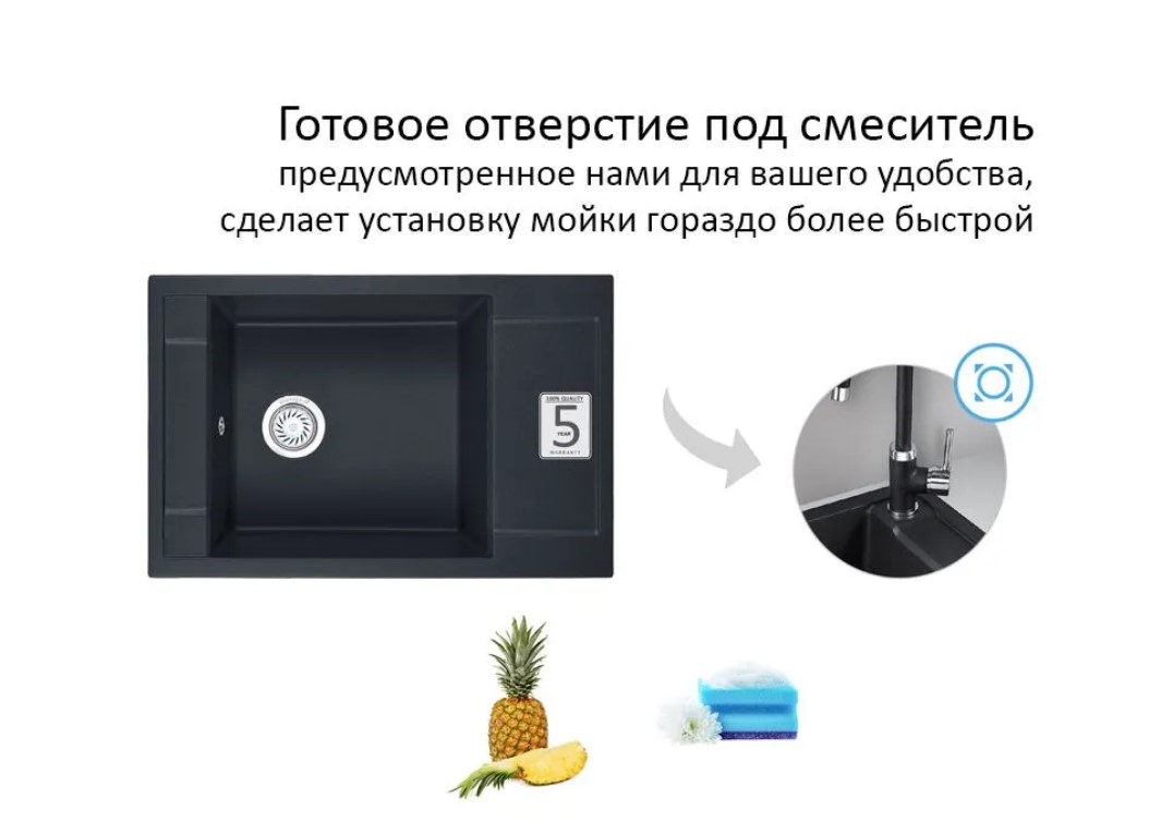 - Готовое отверстие под смеситель, предусмотренное нами для вашего удобства, сделает установку этой мойки гораздо более быстрой и простой!
