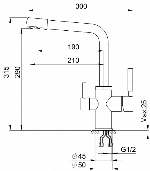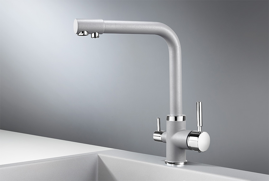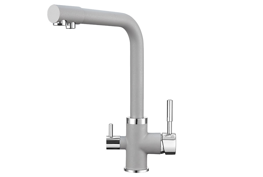 Смеситель для кухонной мойки Granula 2015 изготовлен из высококачественного материала. Латунный корпус обеспечивает длительный срок службы. При этом высокий излив позволяет мыть как мелкую, так и крупногабаритную посуду. Двухрычажная модель смесителя Granula 2015 выполнена с краном для питьевой воды. Фильтрованная вода подается по отдельной трубке и не смешивается с водопроводной водой.