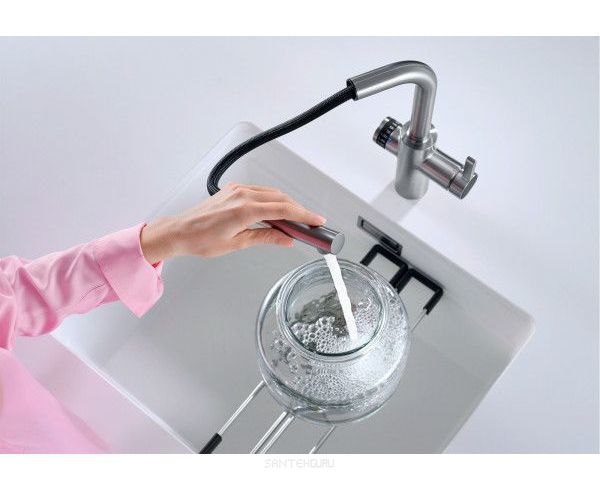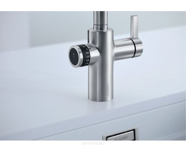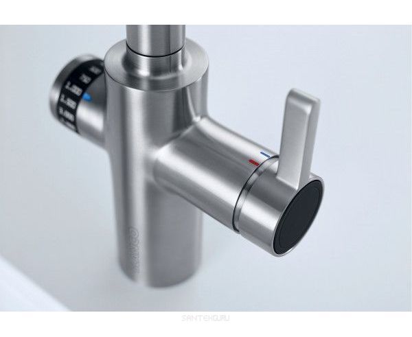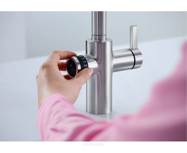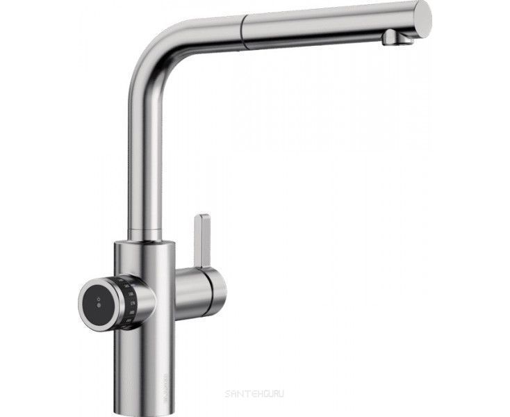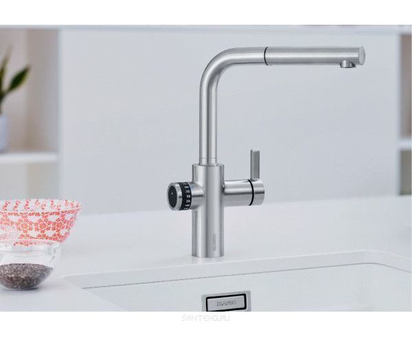 Смеситель для кухни Blanco Evol-S с функцией мерного стакана подойдет тем, кто любит удобство и точность во всем! С помощью поворотной шкалы вы можете задать необходимый вам объем воды, после чего нажать сенсорную кнопку сбоку, и смеситель подаст вам нужное количество воды, регулируя при этом мощность напора в зависимости от выбранного объема: чем больше желаемое количество воды, тем сильнее струя и быстрее поток воды. В результате вы не тратите лишнее время на ожидание. Еще один плюс кухонного смесителя Blanco Evol-S - экономия расходов и сбережение природных ресурсов. Ведь точное потребление воды означает прекращение ненужного расхода самого важного ресурса на земле. Для еще большего удобства в наполнении больших ёмкостей смеситель Evol-S оснащен выдвижной лейкой с нейлоновой оплеткой шланга.