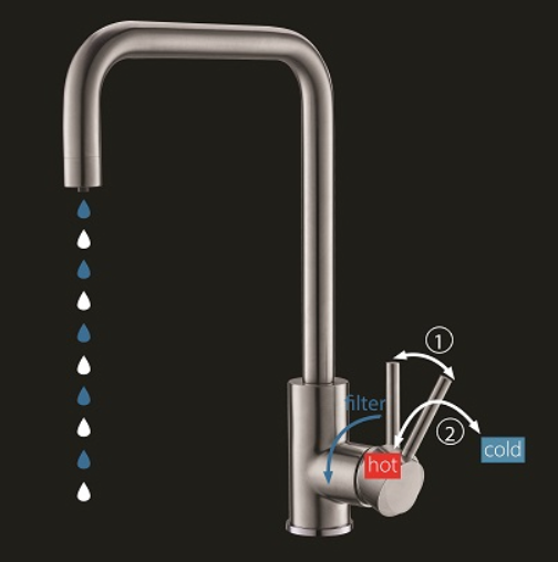 Модель имеет полностью однорычажное управление - и подача водопроводной, и подача фильтрованной воды осуществляются с помощью единого рычага.