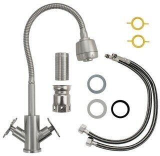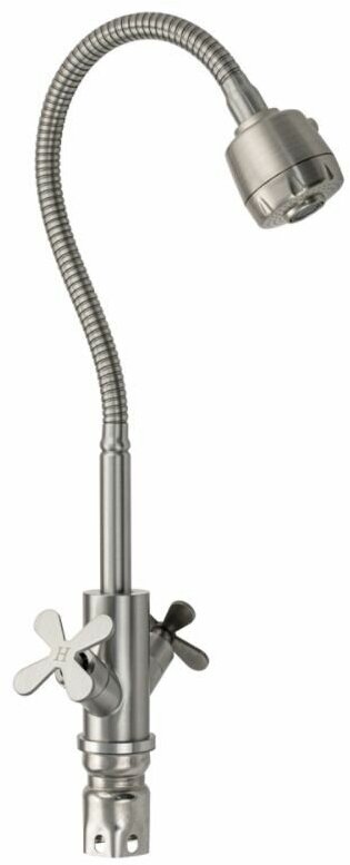 Смеситель для кухонной мойки и раковин, матовый, металлокерамика из нержавеющей стали марки 304, массивный корпус с гибким изливом, с большим двухрежимным аэратором для экономии воды. Крепление резьба - гайка. Кранбуксы металлокерамика 1/2, ручки крест, поворот на 90˚,