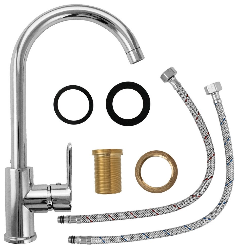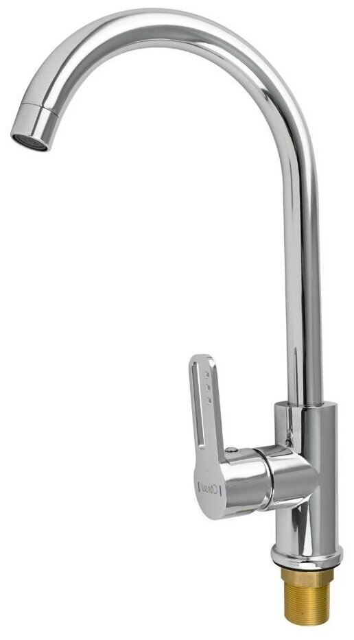 Смеситель для кухонной мойки и раковин, хромированный, боковой, с высоким С-образным изливом, шаровый. Материал изготовления — ЦАМ (цинк-алюминий-медь) + нержавеющая сталь. Крепление резьба - гайка, картридж d = 35 мм, ручка с прорезью. Аэратор для экономии воды.