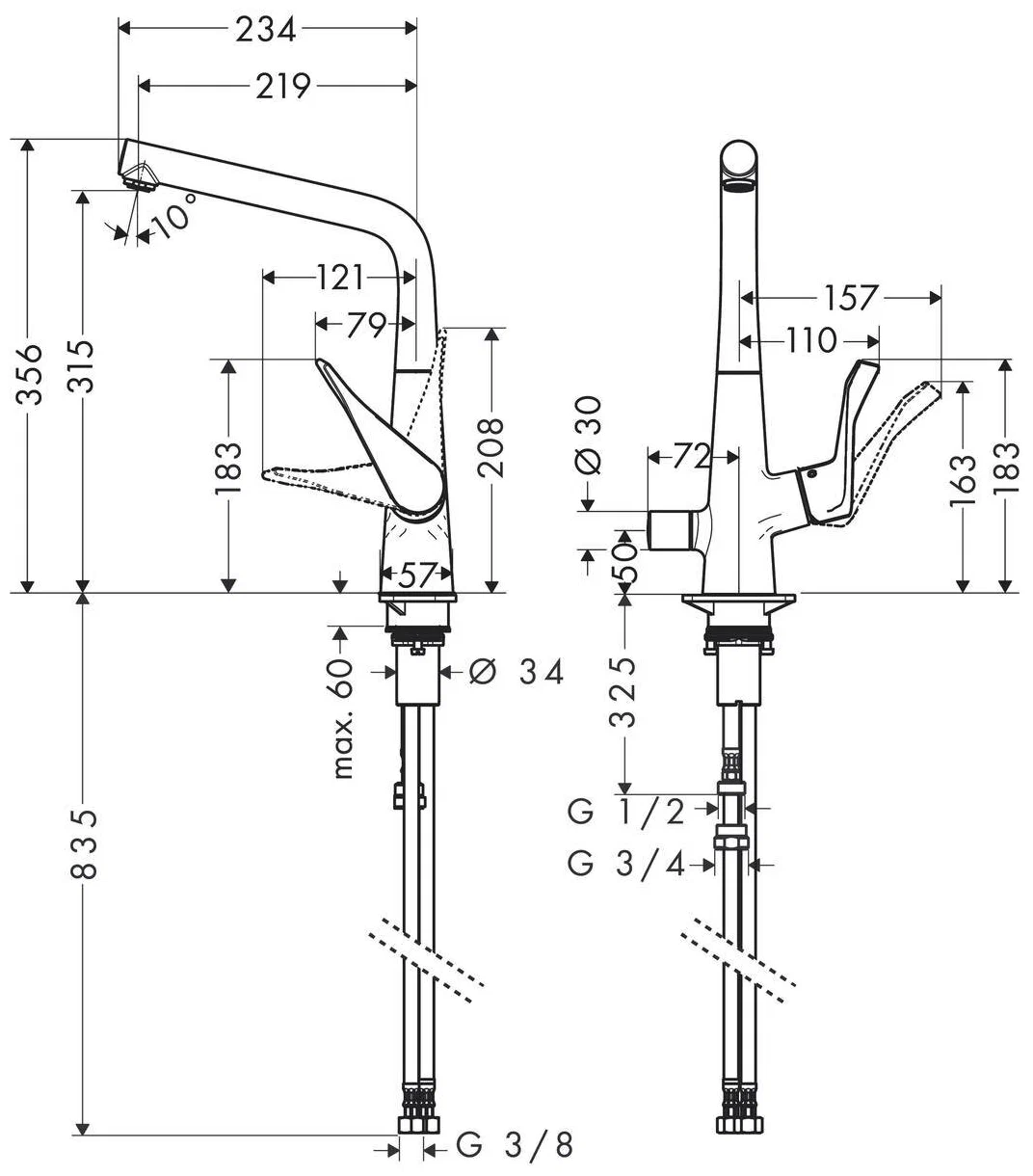 угол поворота излива: регулировка на 3 уровня, на 110°, 150° или 360°