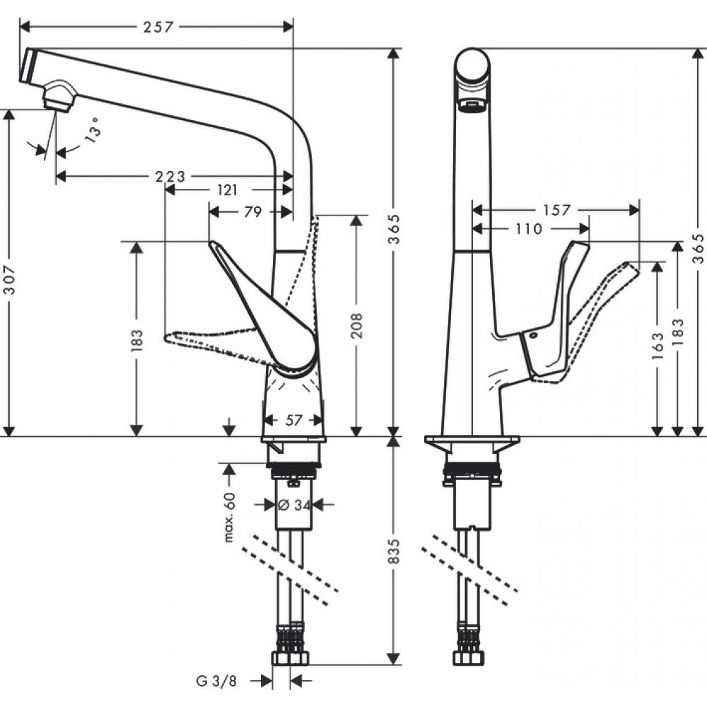 • угол поворота излива : регулировка на 3 уровня, на 110°, 150° или 360°