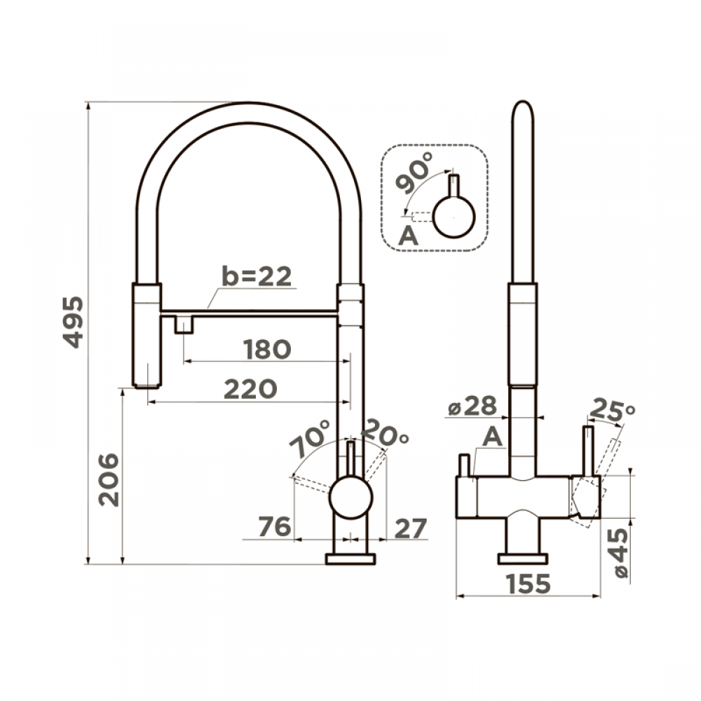 Гибкий съемный шланг с поворотным углом 360 градусов помогает ополаскивать раковину, посуду, овощи, фрукты, наливать воду, не ставя емкость в чашу. Внутри крана есть отдельный проток для фильтрованной воды.