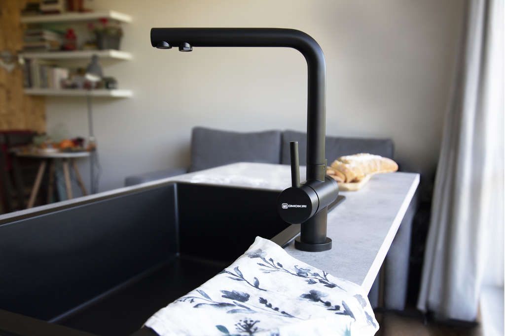 Смеситель для кухни Omoikiri NAGANO с краном для питьевой воды. Вода, проходя через фильтры, подается по специальной трубочке в кран и не смешивается с водопроводной водой. Высокий смеситель оснащен керамическим картриджем и аэратором из пластика, на котором не образуется известковый налет и ржавчина.