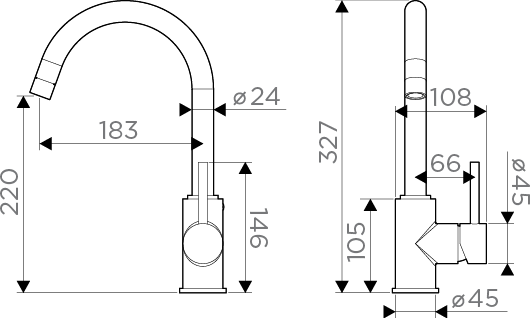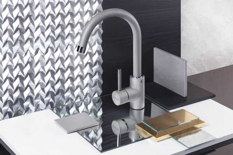Практичный однорычажный смеситель выполнен в современном стиле и снабжен высоким поворотным изливом.