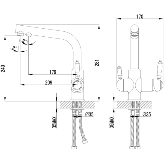 - Для крана с питьевой водой: кран-букса с керамическими пластинами (угол поворота – 90 градусов)