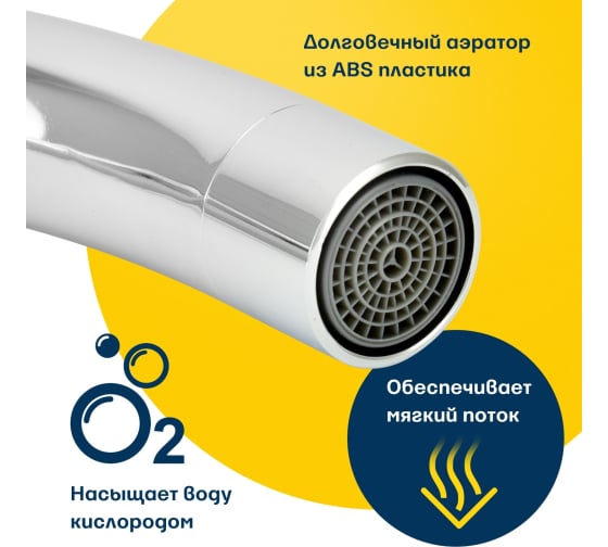 Данная модель представляет собой надежный и современный смеситель с горизонтальным способом установки, устанавливается на мойку или столешницу. Тип крепления – гайка. Смеситель имеет поворотный высокий излив (гусак), длина которого 170 мм, эко-сеточка аэратора выполнена из долговечного ABS-пластика, насыщает воду кислородом, и позволяет уменьшить ее расход.