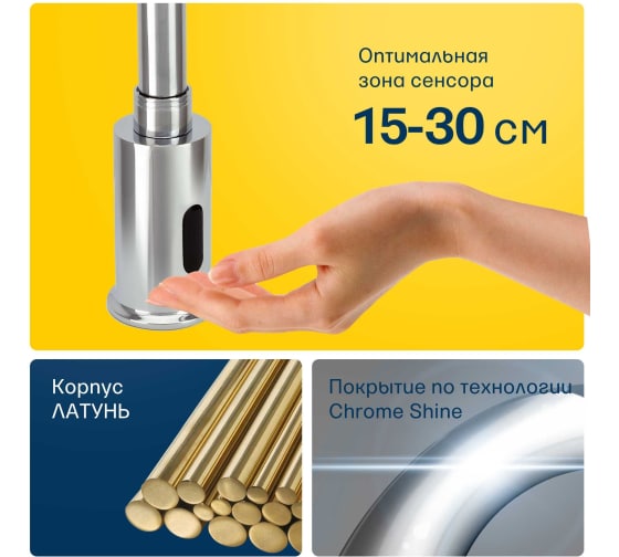 Запорный механизм смесителя - соленоидный клапан, сенсор расположен на передней стенке корпуса, зона срабатывания датчика: 15-30 см (заводская настройка). Регулировать температуру воды и выбирать оптимальный напор струи удобно посредством механического термостата, который входит в комплект. Все элементы конструкции смесителя устойчивы к коррозии, износу и механическим повреждениям, что продлевает период использования изделия. Гипоаллергенное покрытие не раздражает кожу.