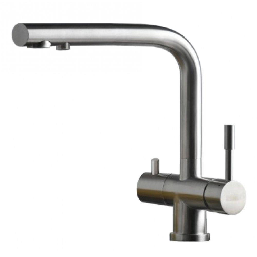 Смеситель Franke Atlas относитcя к серии Clear Water с функцией фильтрации воды. В одном изливе реализован тройной подвод воды: большим рычагом включается холодная или горячая, фильтрованная — малым. Система фильтрации приобретается дополнительно и устанавливается под мойку, о необходимости замены картриджа извещает специальный датчик. Набор для соединения с фильтром входит в комплект поставки.