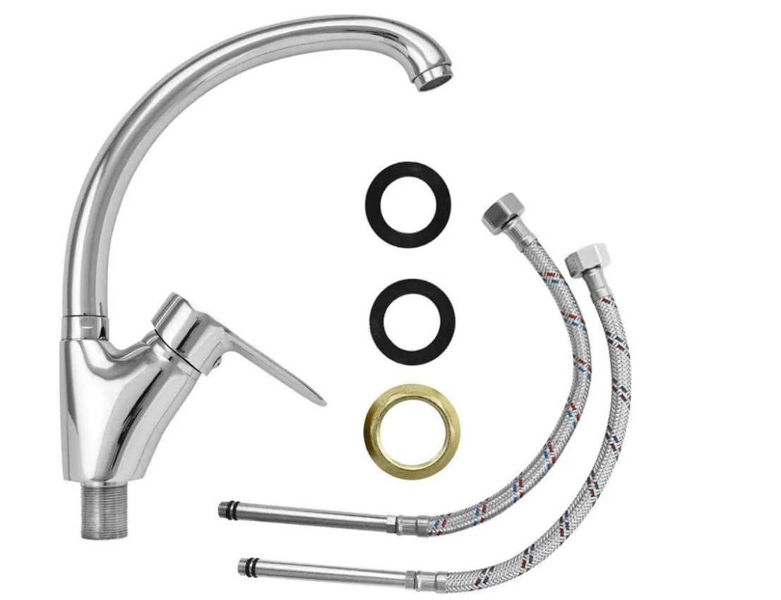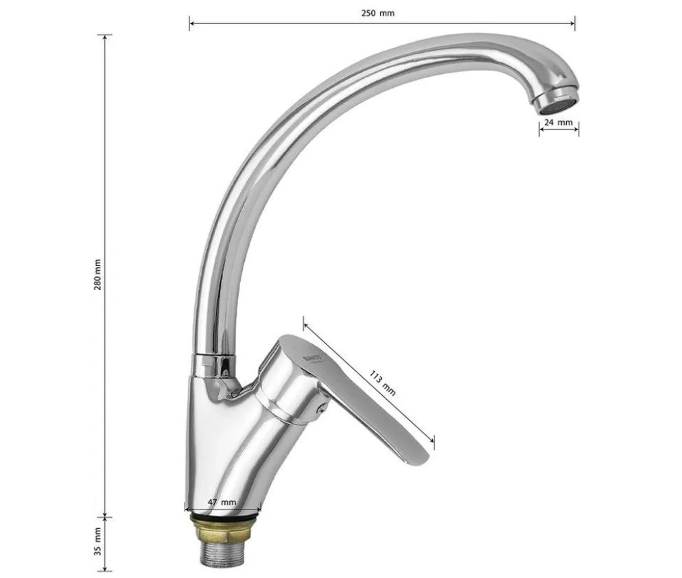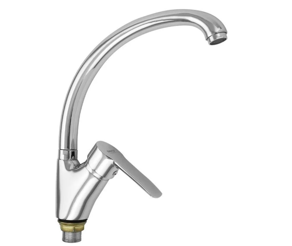 Смеситель для кухонной мойки и раковин, хромированный, боковой, с высоким С-образным изливом, шаровый. Материал изготовления — ЦАМ (цинк-алюминий-медь), Крепление резьба - гайка, картридж d = 35 мм, литая ручка. Аэратор для экономии воды.
