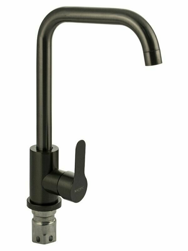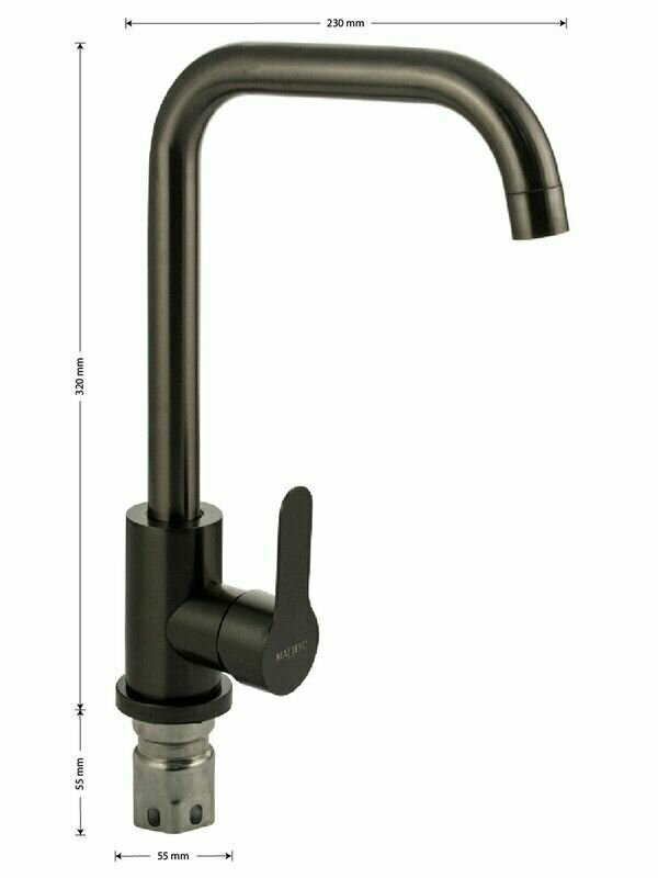 Смеситель для кухонной мойки и раковин, литой матовый корпус графитового цвета, из нержавеющей стали марки 304, с высоким П-образным изливом, шаровый. Крепление резьба - гайка, картридж d = 35 мм, ручка литая. Аэратор для экономии воды. Такая модель может использоваться на домашней кухне, на даче, в медицинских учреждениях и общественных местах. Габаритные размеры: высота 320 мм, длина 230 мм, диаметр посадочного седла 55 мм, длина резьбы 55 мм, длина подводки 450 мм. Вес - 1,4 кг, объём - 0,00490 м3. В комплекте паспорт, корпус с изливом, подводка 1/2, крепеж, набор прокладок