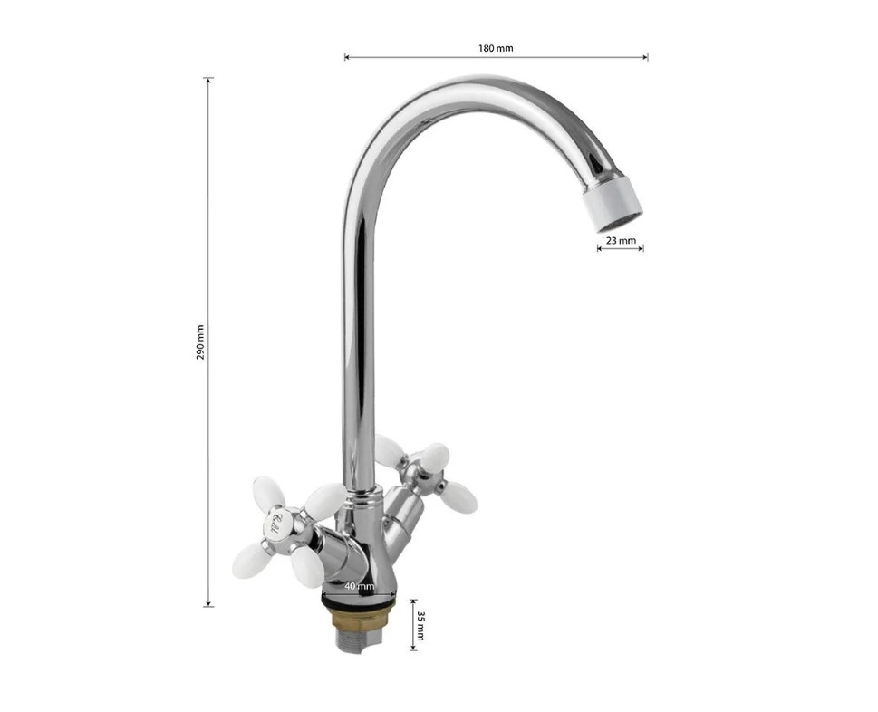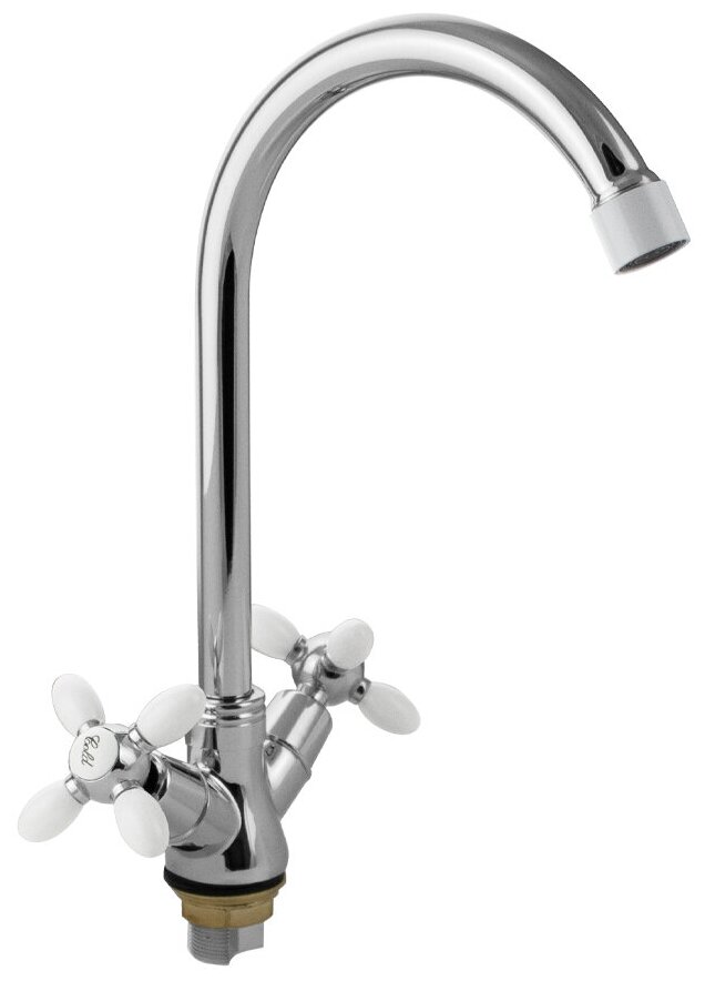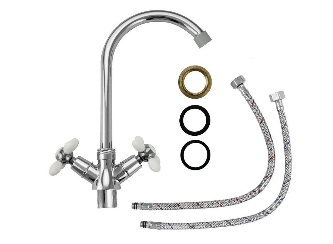 Смеситель кухонный серп и молот, металлокерамика, белые вставки на ручках и аэраторе, крепление на гайке, подводка, комплект прокладок.