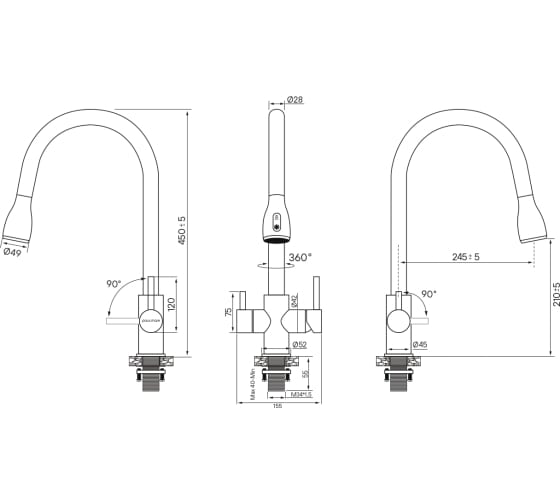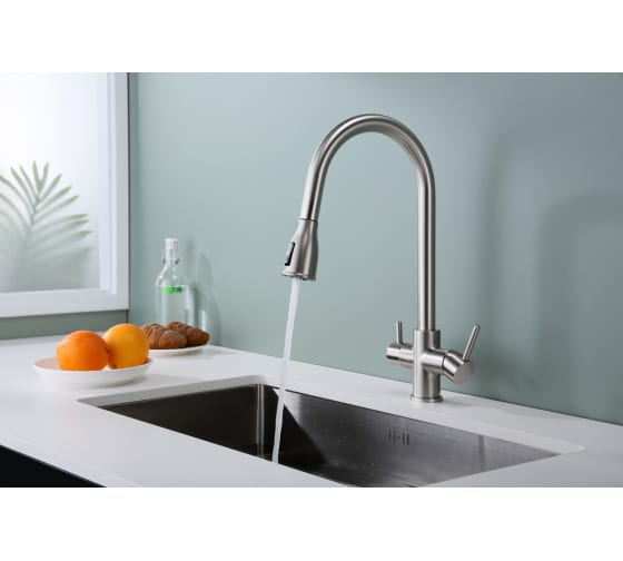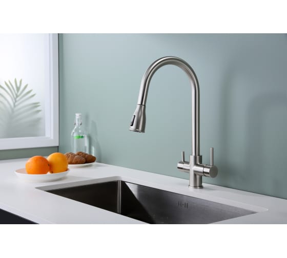Смеситель для кухни изготовлен из высококачественной латуни, которая отвечает высочайшим европейским стандартам качества, не содержит свинца, не разрушается со временем и безопасна для здоровья.