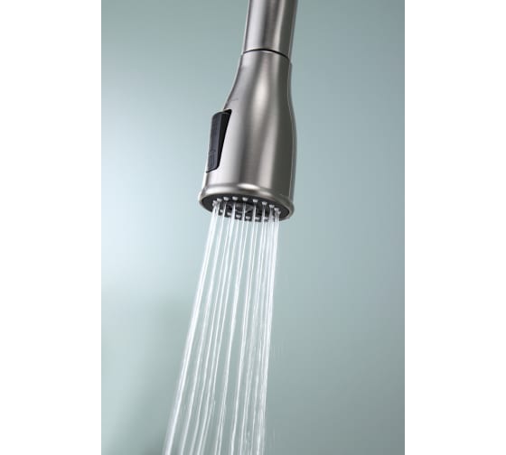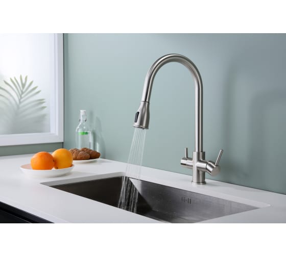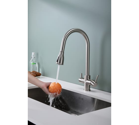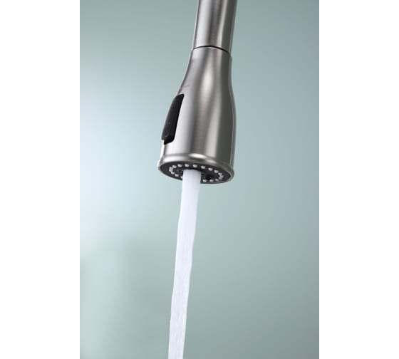 Конструкция смесителя с вытяжным шлангом значительно облегчает процесс мойки посуды или продуктов любого размера и формы.