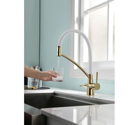 Смеситель для кухни Paulmark Sigen Si213111-Gw золото, белый шланг, резиновый излив изготовлен из прочной и надежной латуни. Латунь не подвержена коррозии, поэтому смеситель прослужит много лет.