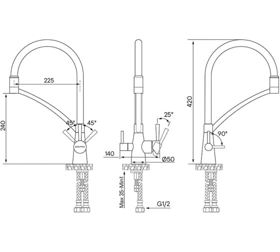 Смеситель оснащен гибким изливом, который удобен для чистки и ополаскивании раковины, а также для наполнения водой больших емкостей.