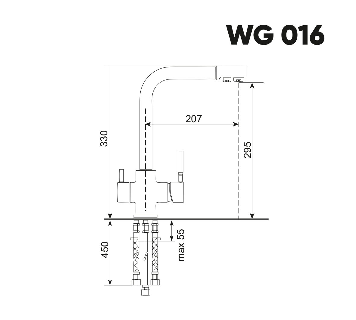 Комплектация: гибкая подводка, комплект креплений, переходник для подключения фильтра с питьевой водой