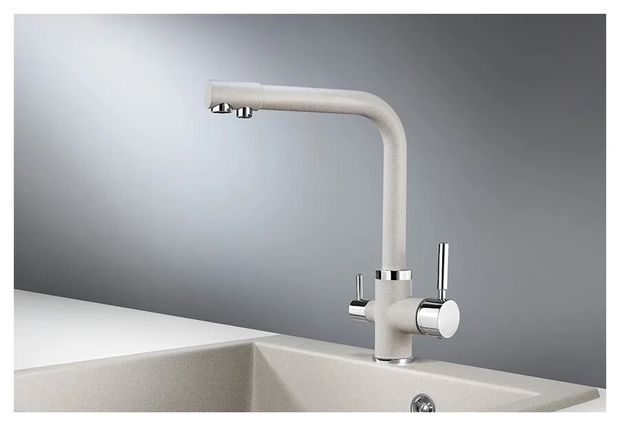 вес 1.8 кг; максимальная толщина столешницы 25 мм; система подачи питьевой воды активируется при помощи второго рычага, реализована благодаря подаче фильтрованной воды через отдельную трубку
