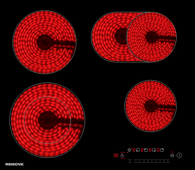 - Мощность конфорок : 2200вт *1 – 2000вт *1 – 1800вт *1 – 1200вт*1