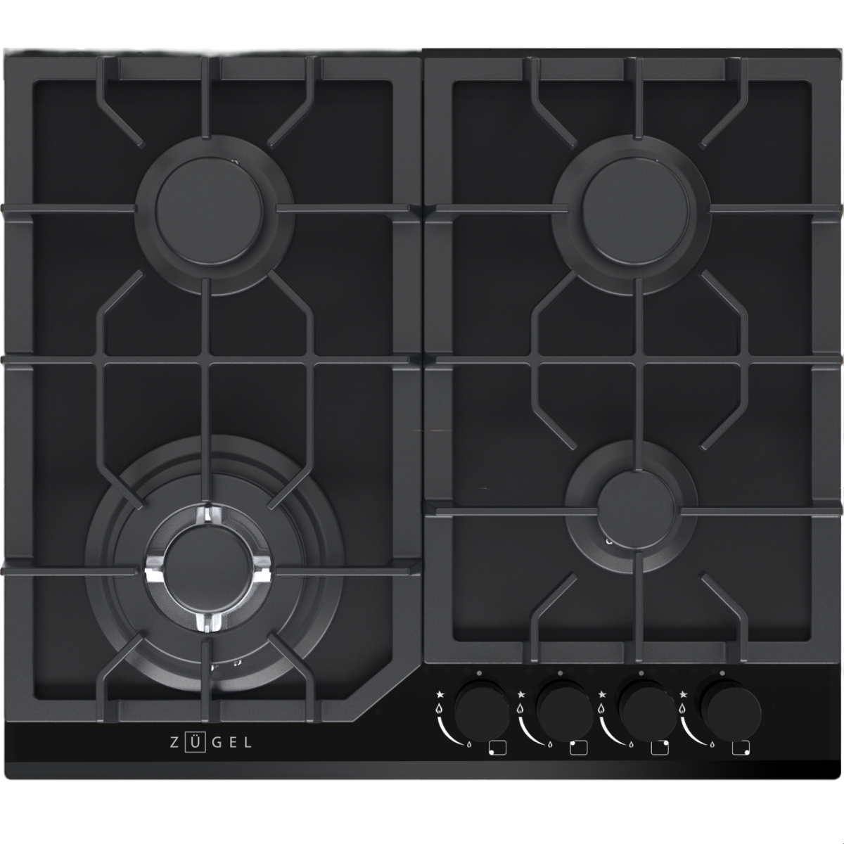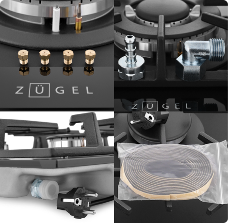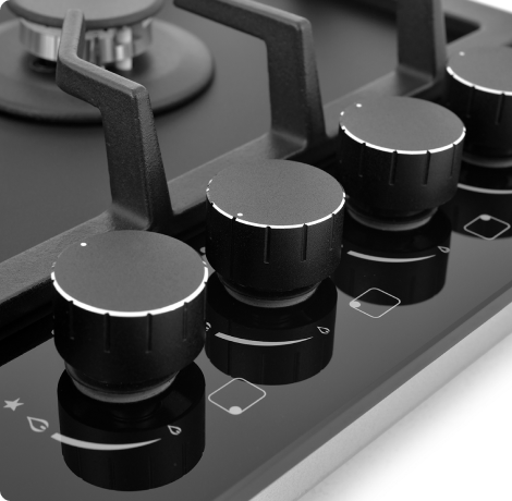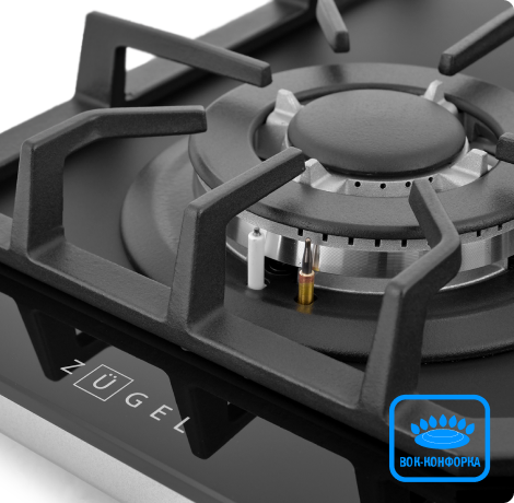 Мощная WOK-конфорка с 2 рассекателями и тройным контуром огня, Металлические дизайнерские ручки, Технология "газ на стекле", Форсунки для конверсии(природный/сжиженный) газа в комплекте