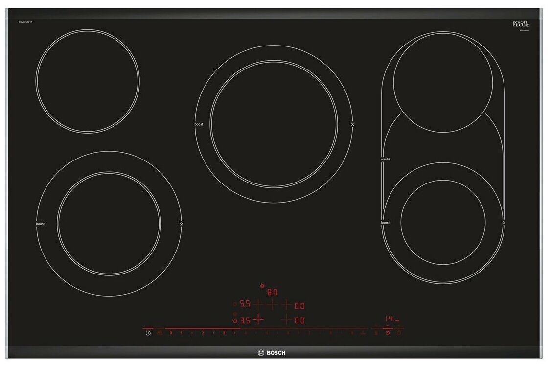 конфорка диаметром 14,5 см, с круглой зоной расширения диаметром 21 см, конфорка диаметром 18 см, с круглой зоной расширения диаметром 23 см, две конфорки диаметром 14,5 см, конфорка диаметром 12 см, с круглой зоной расширения диаметром 18 см, и с овальной зоной расширения 37 см