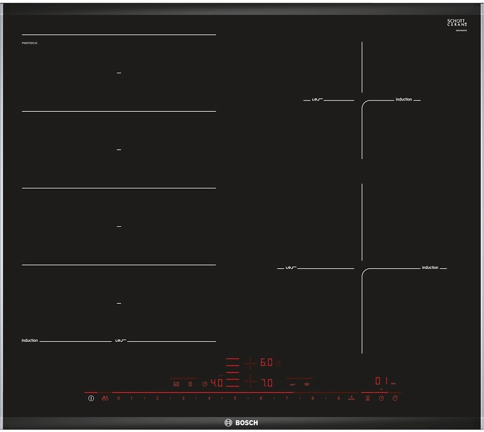 Конфорки 1 x Ø 380 мм x 240 мм, 3.3 кВт (В режиме PowerBoost - 3.7 кВт) или 2 x Ø 190 мм, 2.2 кВт (В режиме PowerBoost - 3.7 кВт); 1 x Ø 145 мм, 1.4 кВт (В режиме PowerBoost - 2.2 кВт);1 x Ø 210 мм, 2.2 кВт (В режиме PowerBoost - 3.7 кВт)