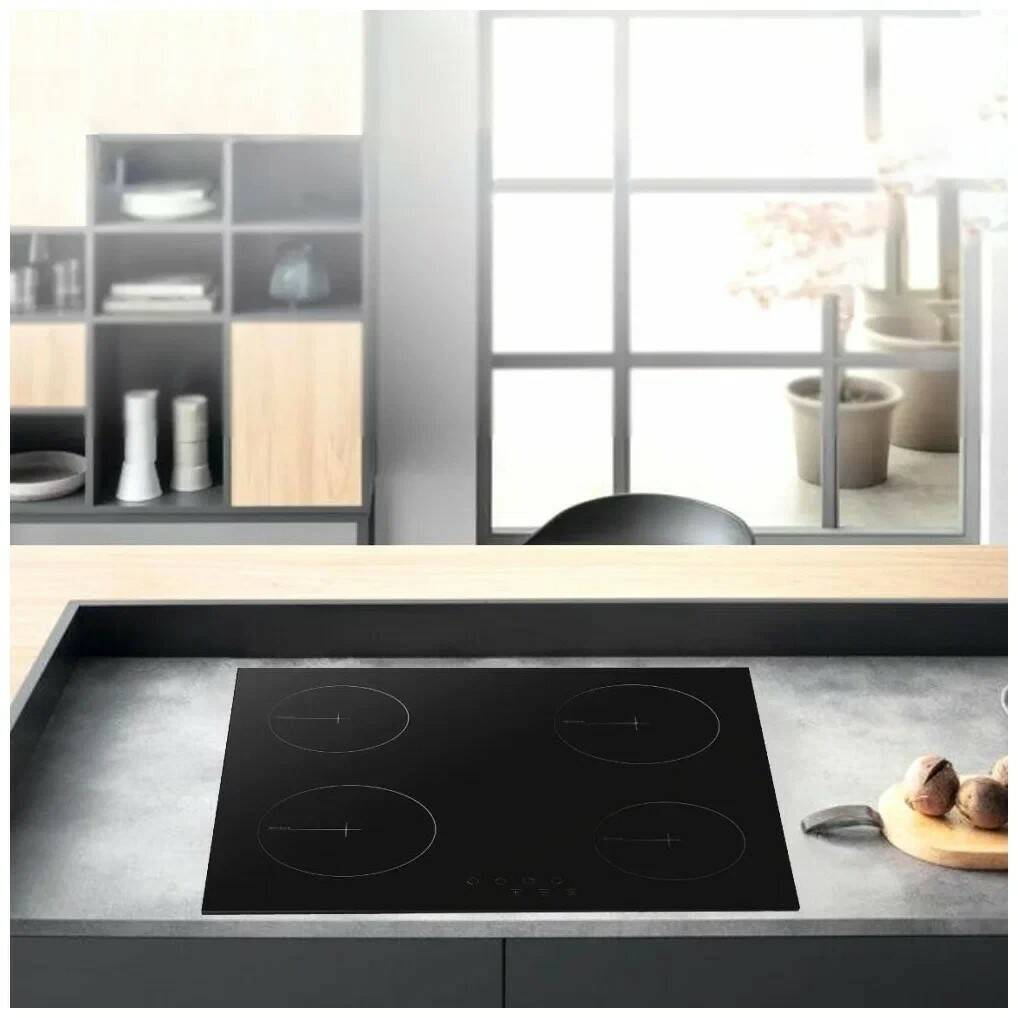 защитное отключение конфорок, индикатор остаточного тепла, кнопка блокировки панели