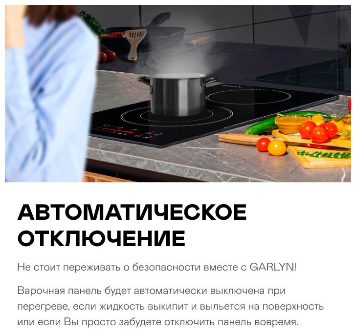 защитное отключение конфорок, индикатор остаточного тепла, кнопка блокировки панели