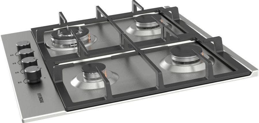 независимая; общая мощность конфорок 7600Вт; количество конфорок 4; поверхность нержавеющая сталь; решетка чугун; автоматический электроподжиг; ширина 590мм; цвет нержавеющая сталь