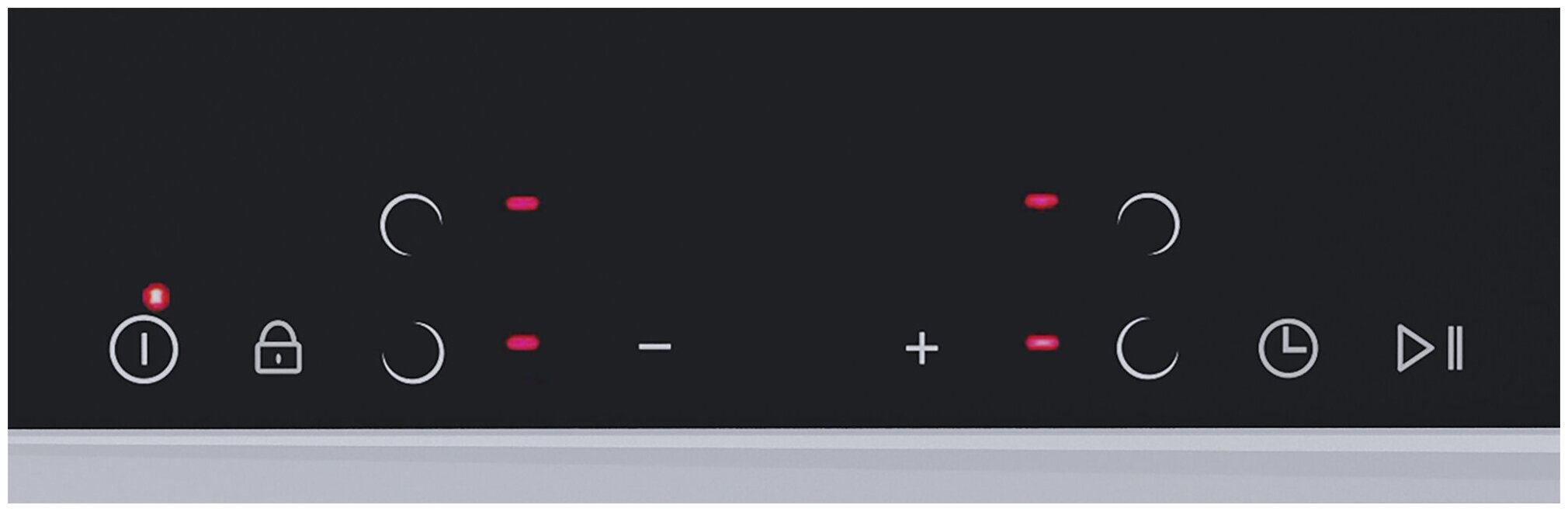 защитное отключение конфорок, кнопка блокировки панели, индикатор остаточного тепла, индикатор наличия посуды