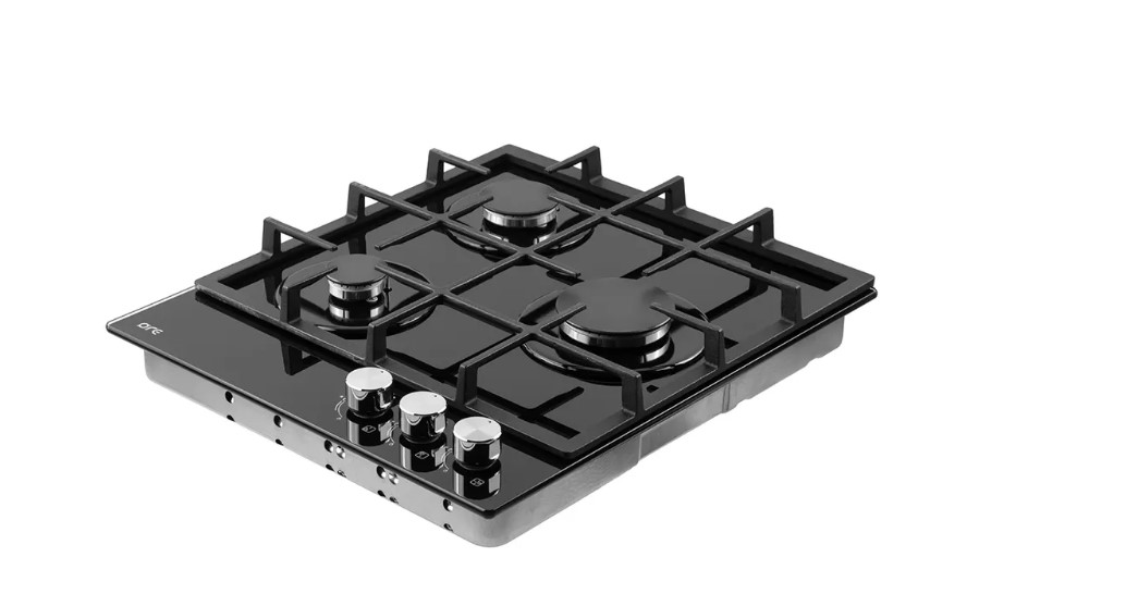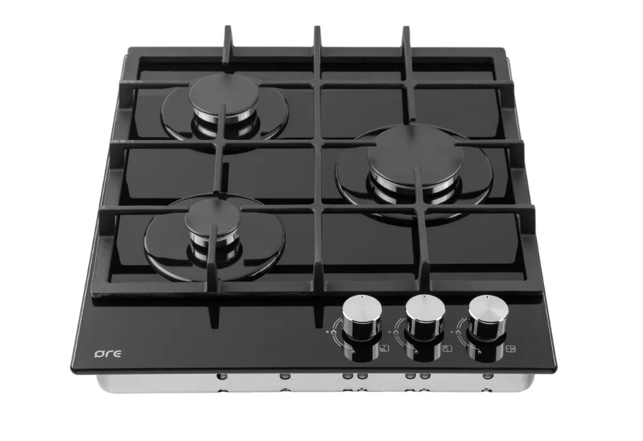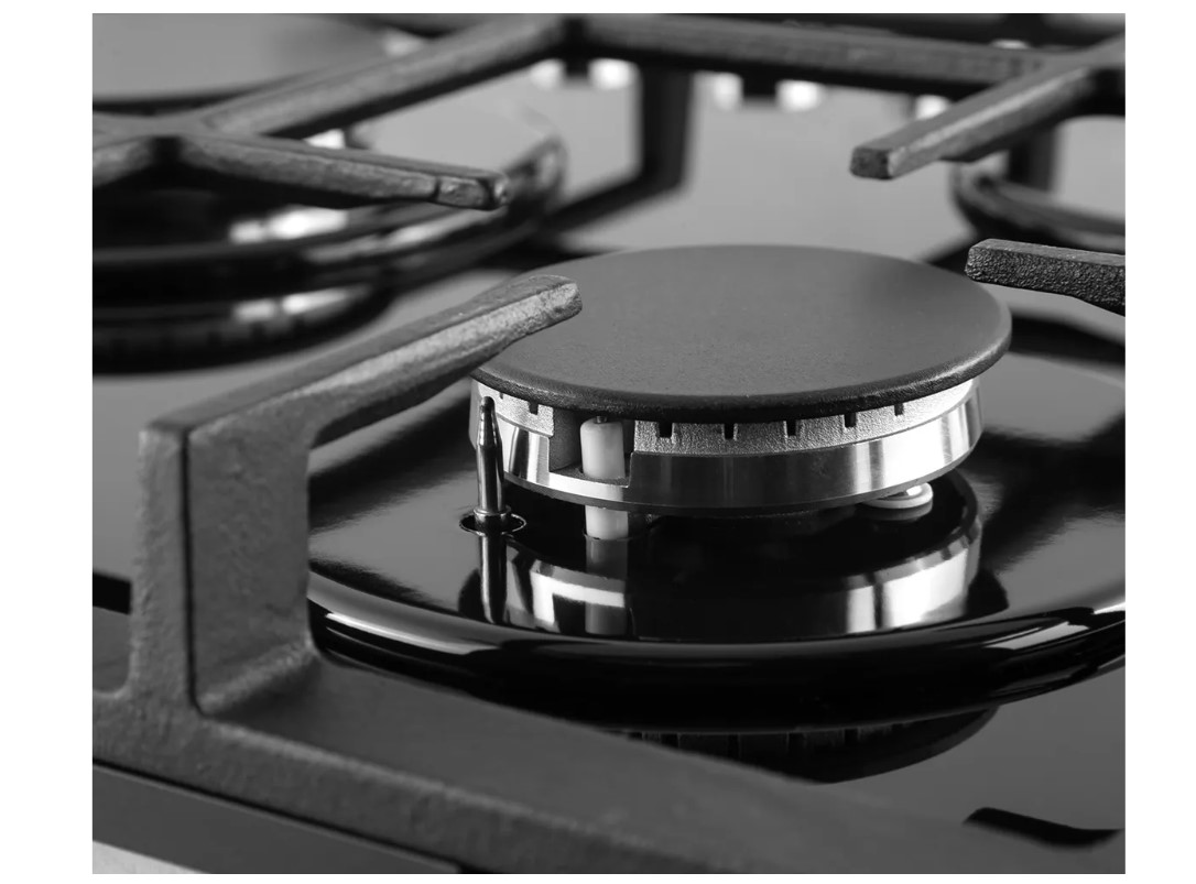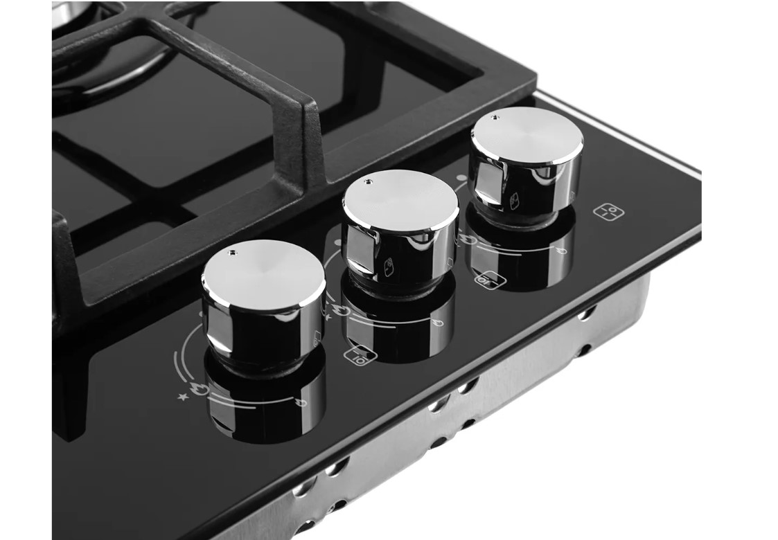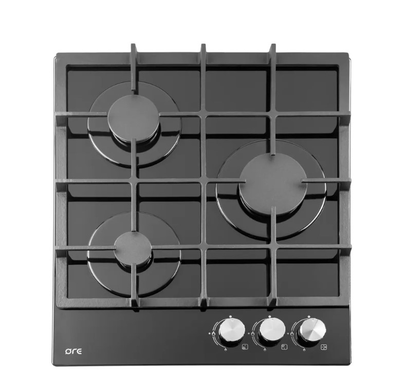 Встраиваемая газовая варочная панель с рабочей поверхностью из закаленного стекла (черный). Комплектация: 3 конфорки, чугунная монолитная решетка, электроподжиг, газ-контроль.