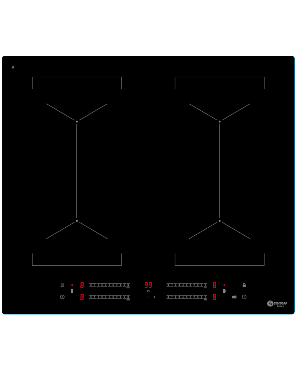 Диаметр конфорок φ180mm, 1900w - booster 2200w φ180mm, 1300w - booster 1500w φ180mm, 1900w - booster 2200w φ160mm, 1300w - booster 1500w