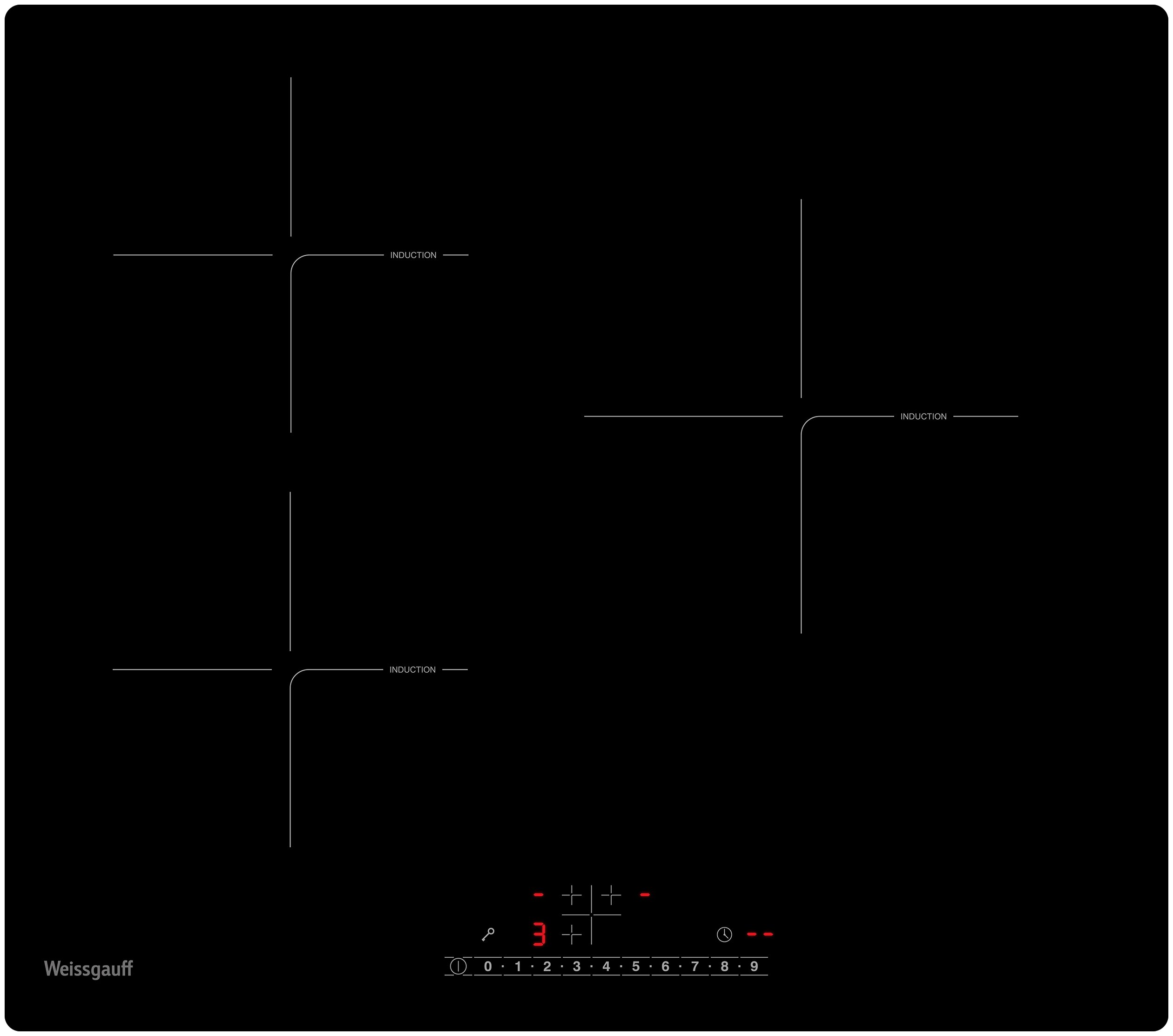 защитное отключение конфорок, кнопка блокировки панели, индикатор остаточного тепла